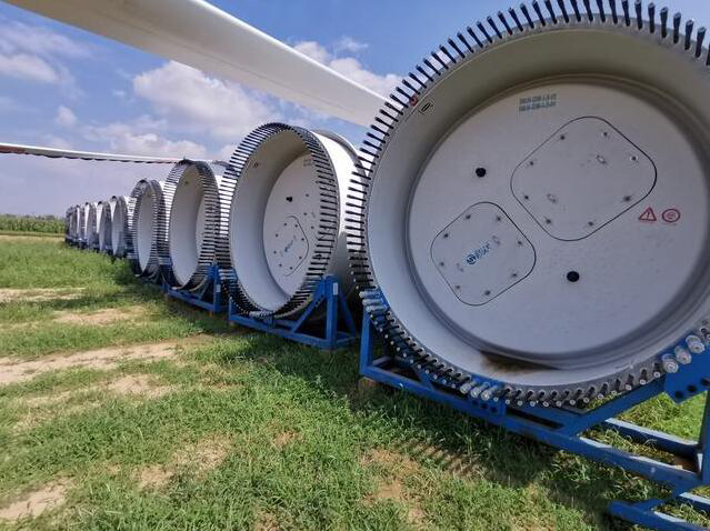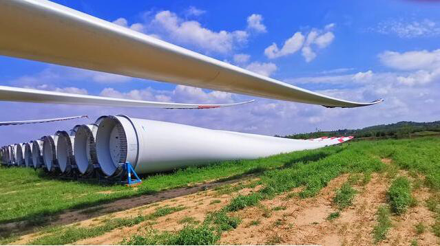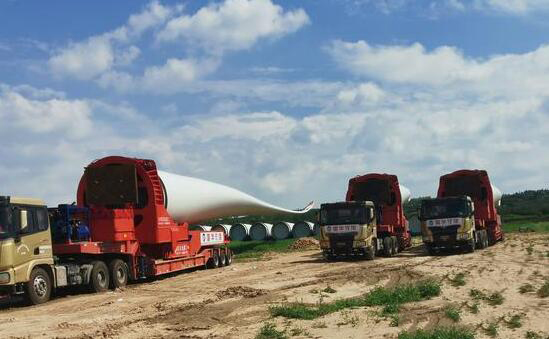 這些卡車上拉著的很大、很長、像飛機翅膀一樣的龐然大物就是風(fēng)力發(fā)電機的葉輪,就是我們所說的葉片??傞L度60多米,二十多噸重。